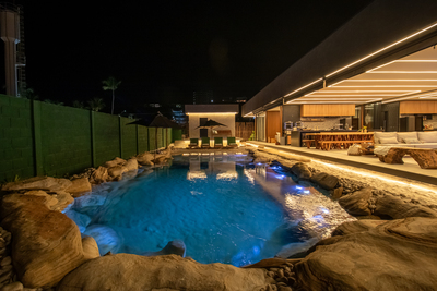 Além da rapidez construtiva, o projeto buscou reduzir o uso de materiais de alto impacto ambiental. Um dos destaques é a piscina em formato de lago naturalizado, que substitui o concreto convencional e evitou a aplicação de mais de 60 metros cúbicos desse material, cuja produção está entre as maiores fontes industriais de emissão de carbono.